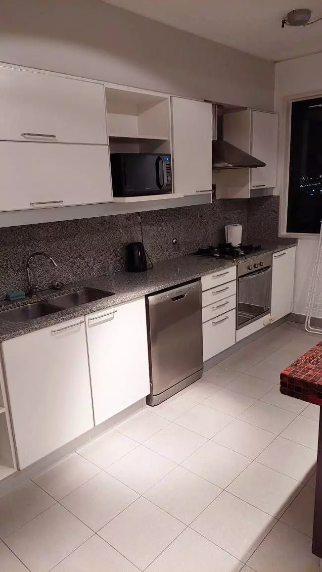 Bright, modern 3-bedroom apartment with a balcony and panoramic view. Living room with sofa, table, Smart-TV. Kitchen is combined with the living room and separated by a bar counter, includes a WASHER and DISHWASHER. Bedroom 1: double bed, wardrobe, Smart-TV. Bedroom 2: single bed, closet, desk. Two bathrooms. Air conditioning installed (heat/cold). Double glazed windows.