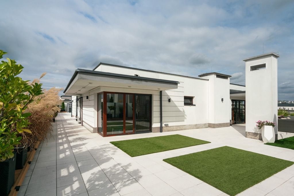 Grundriss und Funktionalität: Die Wohnung ist nach drei Seiten ausgerichtet, lichtdurchflutet und besticht durch einen außergewöhnlich funktionalen Grundriss: ein geräumiges Wohnzimmer mit Essbereich und Zugang zur Terrasse, eine moderne Küche mit Kochinsel und vollintegrierten Geräten, ein Hauptschlafzimmer mit Bad en suite, ein zusätzliches Schlafzimmer/Gästezimmer, ein elegantes Büro oder Bücherregal mit Einwegspiegel, ein repräsentativer Flur und Badezimmer mit hochwertiger Ausstattung. Die Wohnung verfügt über 4 Zimmer, Hauswirtschaftsräume, einen Waschraum und eine beeindruckende 350 m² große Terrasse.