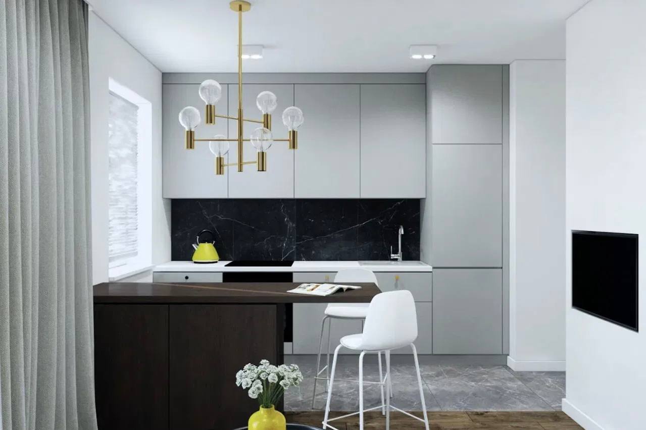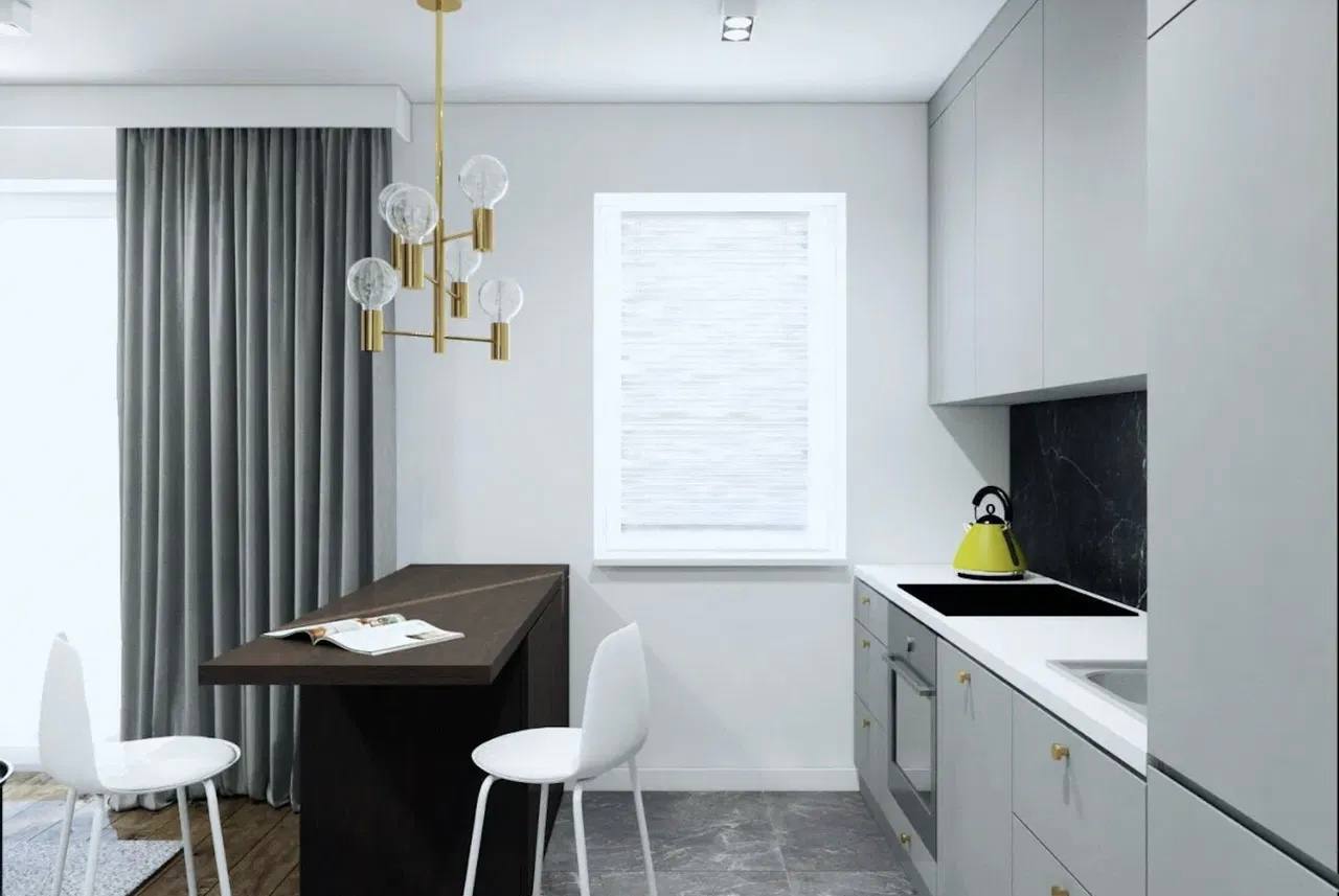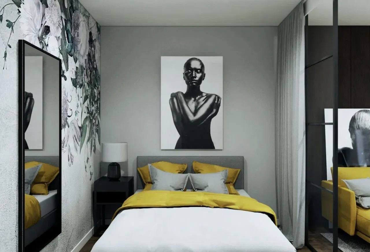 Aufteilung: Eingangsbereich mit geräumigem Einbauschrank, Badezimmer, Wohnzimmer mit Kochnische und Zugang zum Balkon, separates Schlafzimmer (abgetrennt durch eine moderne Glas-Metall-Konstruktion).