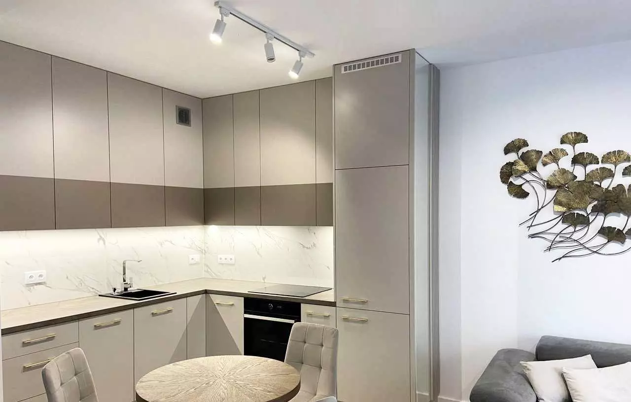 – Maßgefertigte Küche: Backofen, Induktionsherd, Geschirrspüler, Einbaukühlschrank