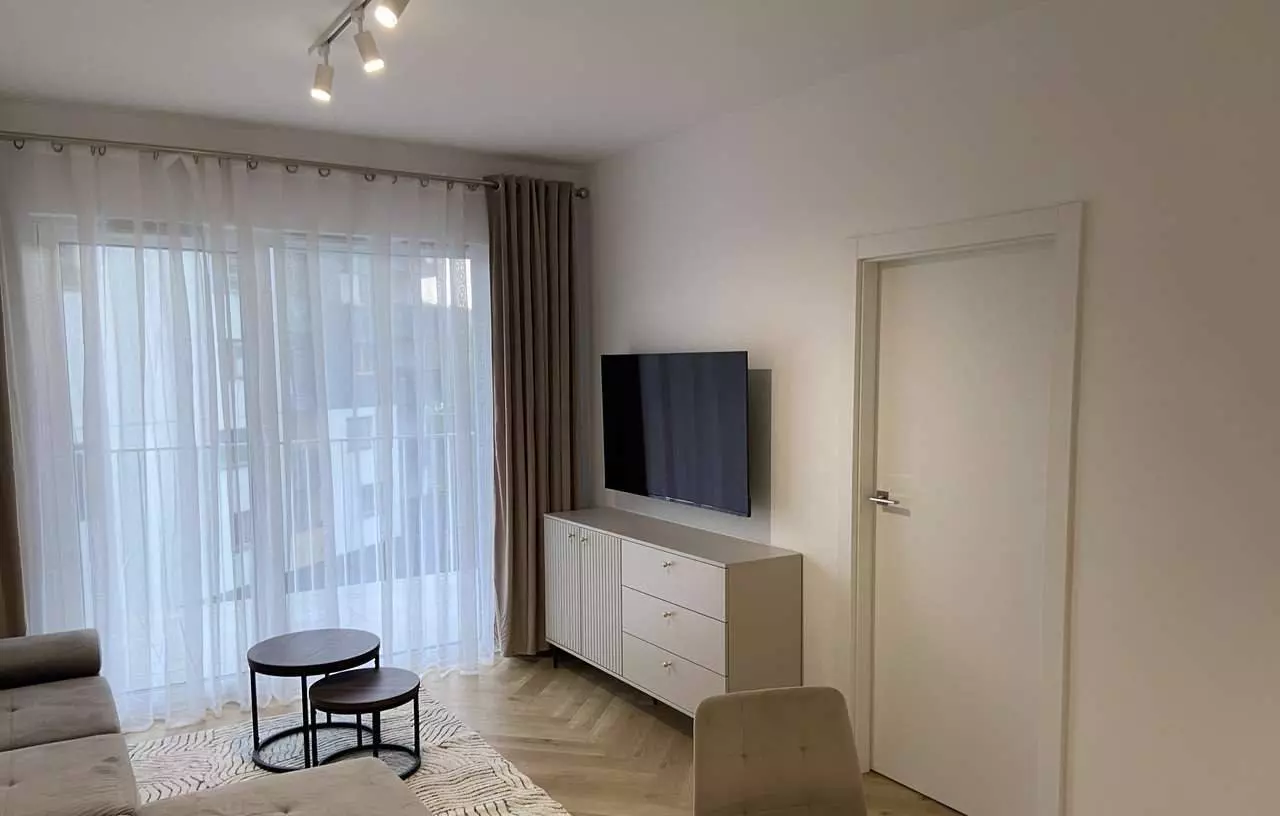 – Wohnzimmer: Ecksofa, 55-Zoll-Fernseher, Tisch, Panoramafenster