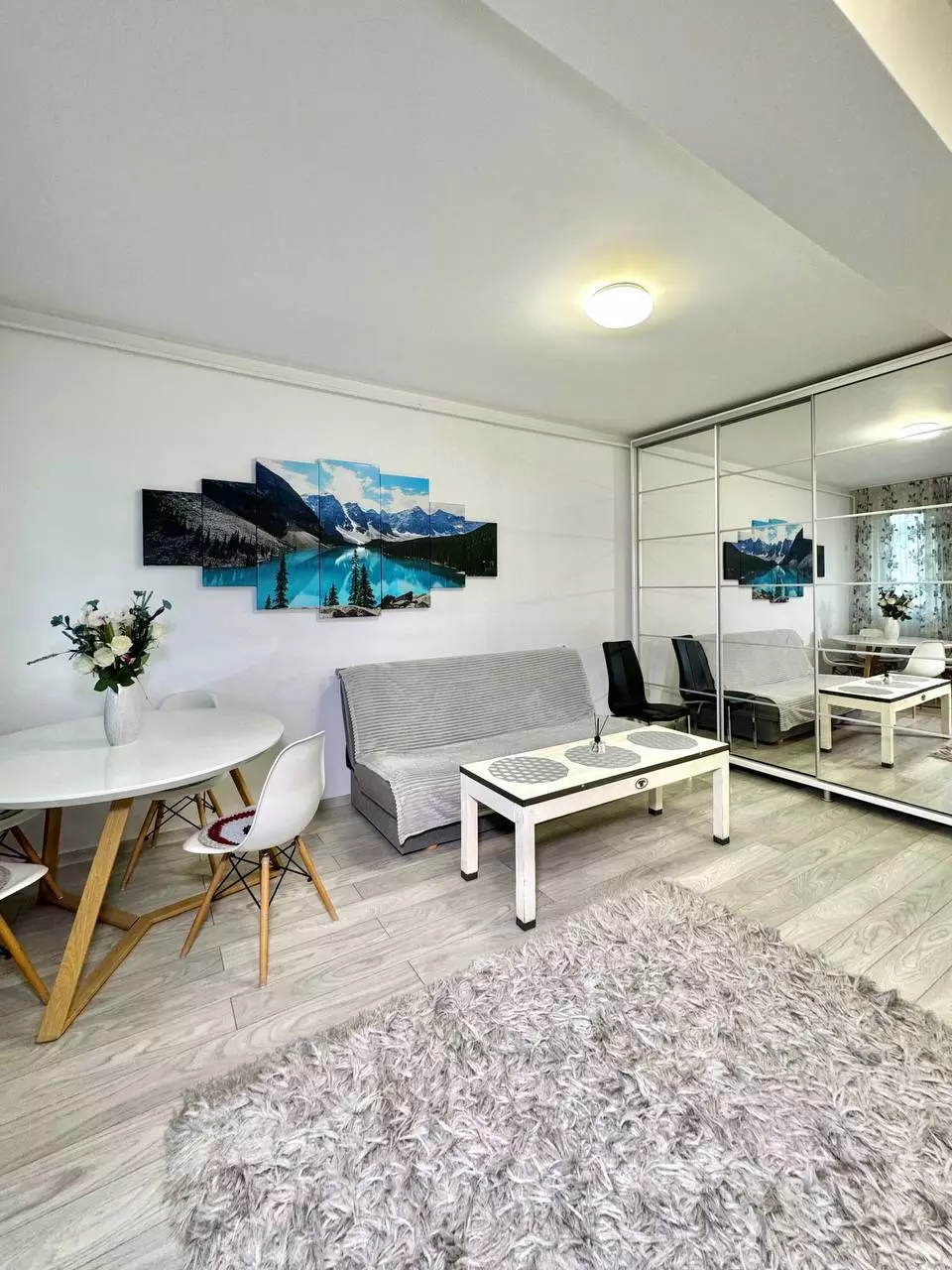 Fully equipped: refrigerator, hood, dishes, bed, sofa, pillows/blankets, TV, washing machine, stove, oven, tables, chairs, bathroom