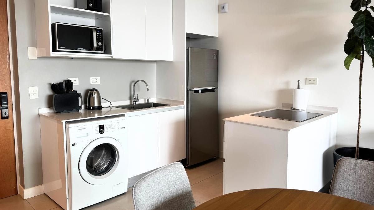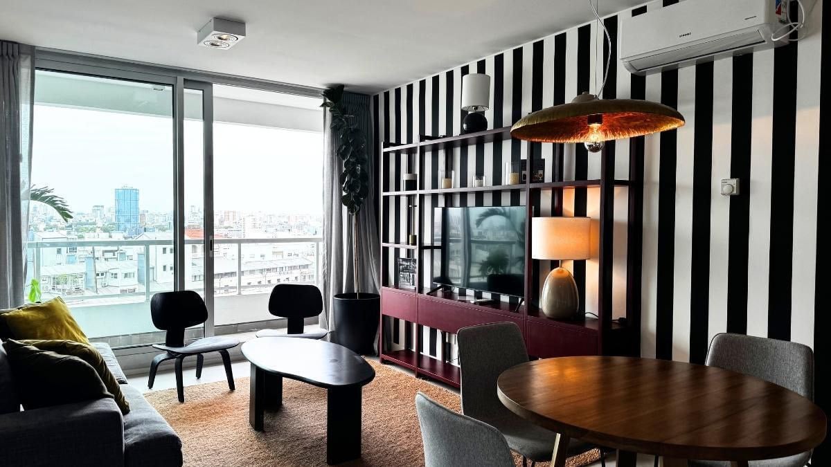 Modern, stylish three-room apartment with a balcony. Bright, spacious living room with a sofa, dining area, and Smart TV. A fully equipped kitchen with a washing machine is included.