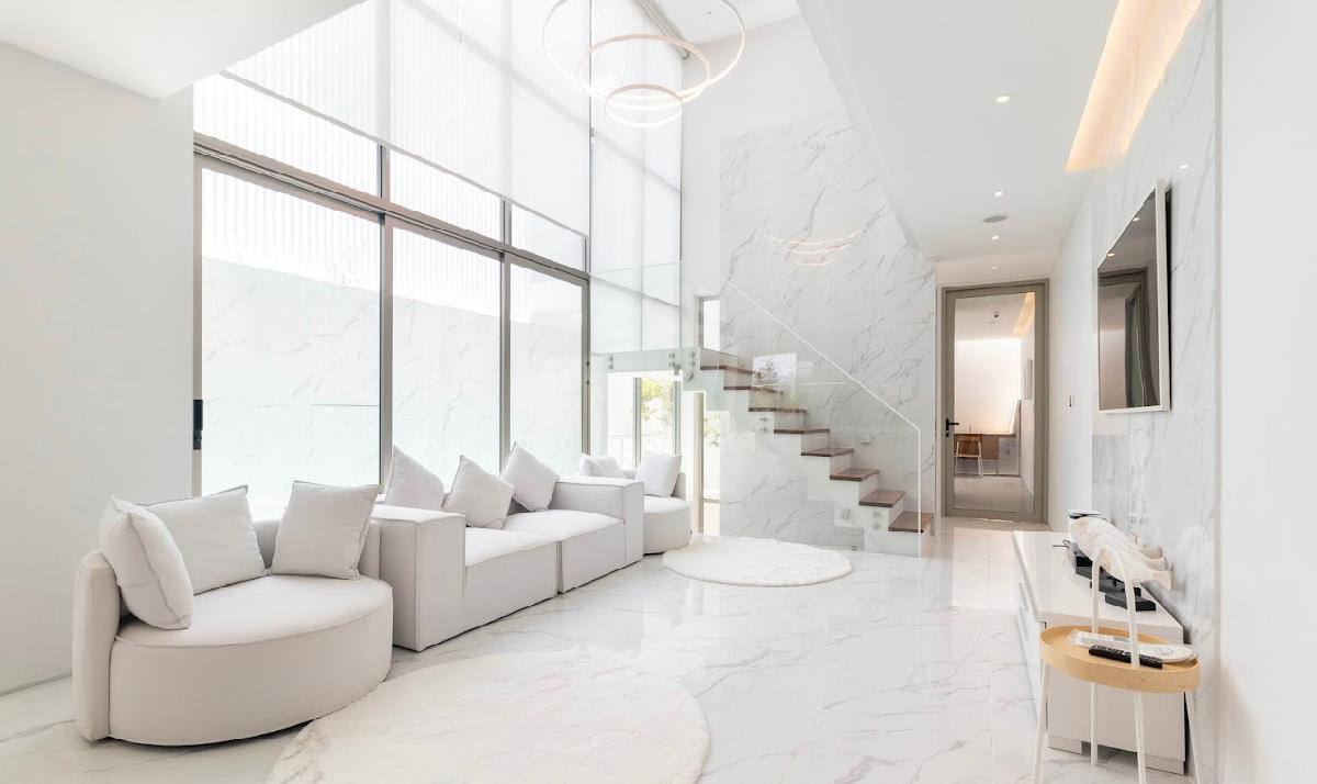 ⏺Villa amenities: ▪️3 bedrooms ▪️4 bathrooms ▪️Spacious, bright layout ▪️Enclosed terrace and private pool ▪️Smart home system ▪️Comfortable sofa in the living room, panoramic windows overlooking the pool ▪️Outdoor terrace with a chill-out area ▪️Fully equipped kitchen with a cooking island, oven, and dishwasher ▪️Dining table for 6 ▫️Premium materials ▫️Tumble dryer and washing machine ▫️Private pool with jacuzzi and waterfall ▫️Private two-car garage ▫️Private gated community with video surveillance and security