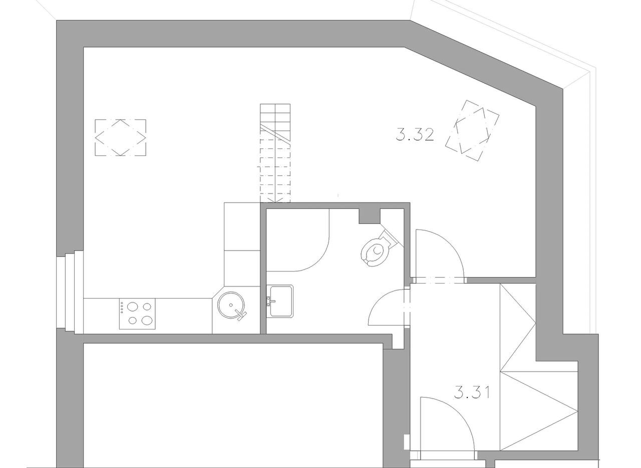 Layout: hallway, bathroom with shower, living room with kitchen, bedroom on the second level.