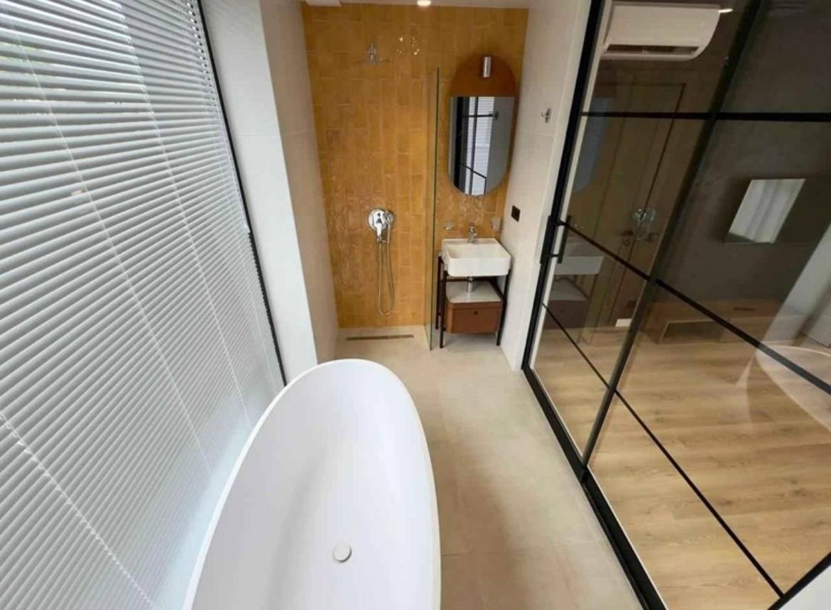 ✔️ 150 m² ✔️ Central heating ✔️ Designer renovation ✔️ Fully furnished and equipped with appliances ✔️ Oven, dishwasher ✔️ 2 bathrooms, bathtub ✔️ Private terrace and yard ✔️ Pool
