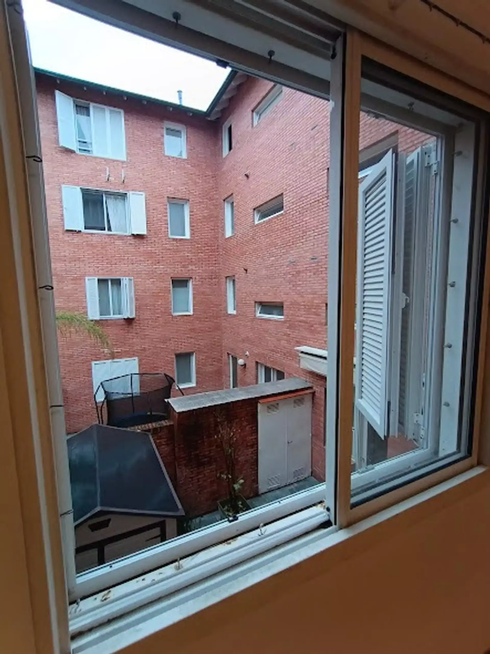 Second bedroom with built-in closet and views of the courtyard.