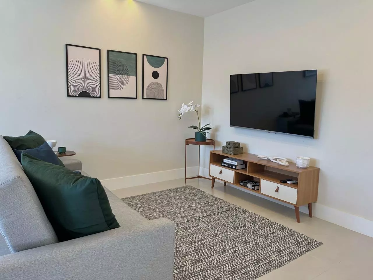 Living room with a sofa, Smart TV, dining area.