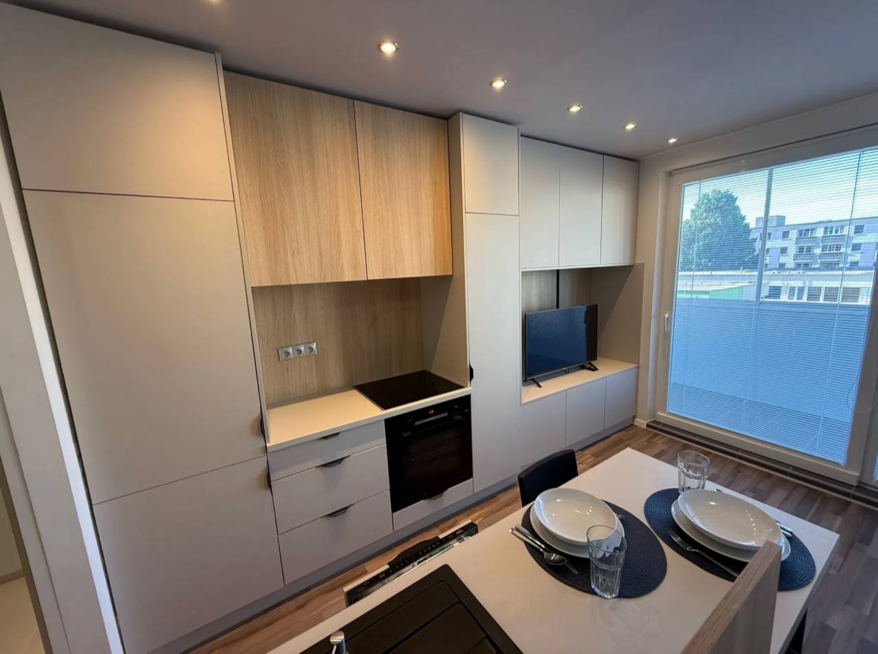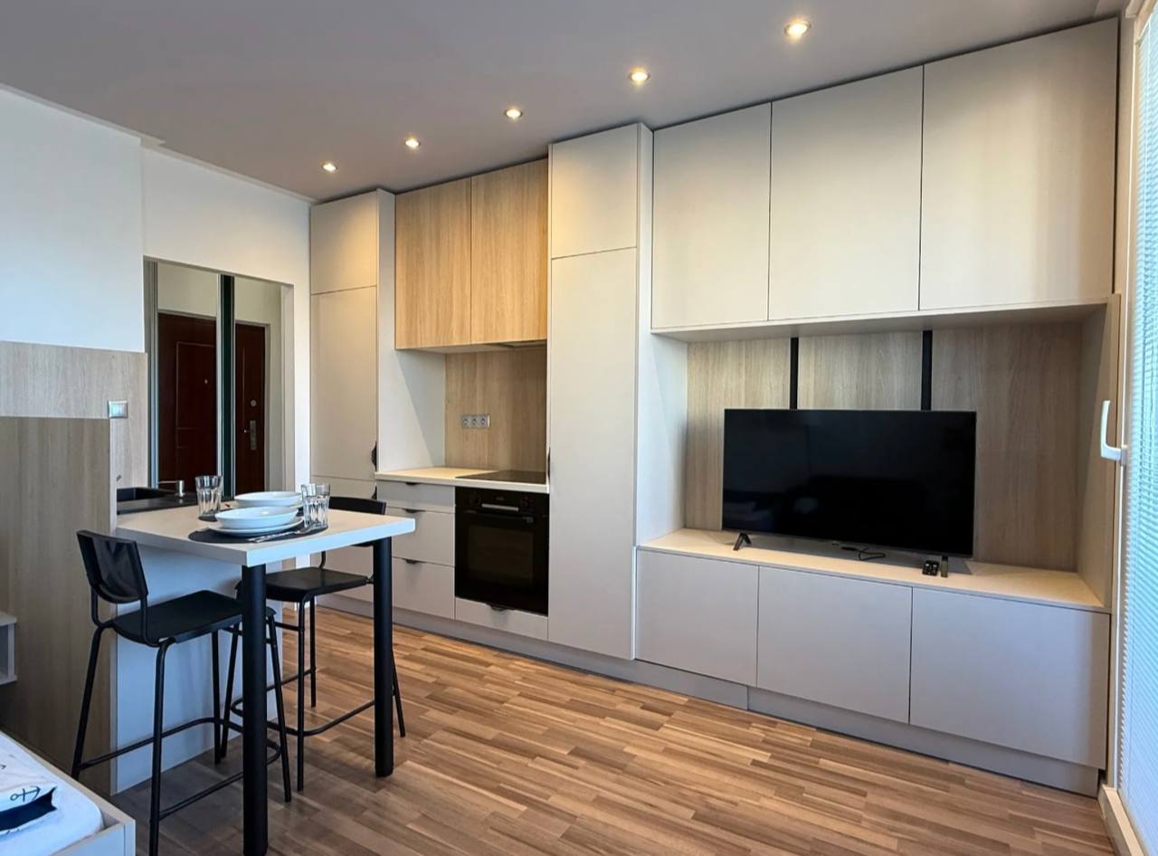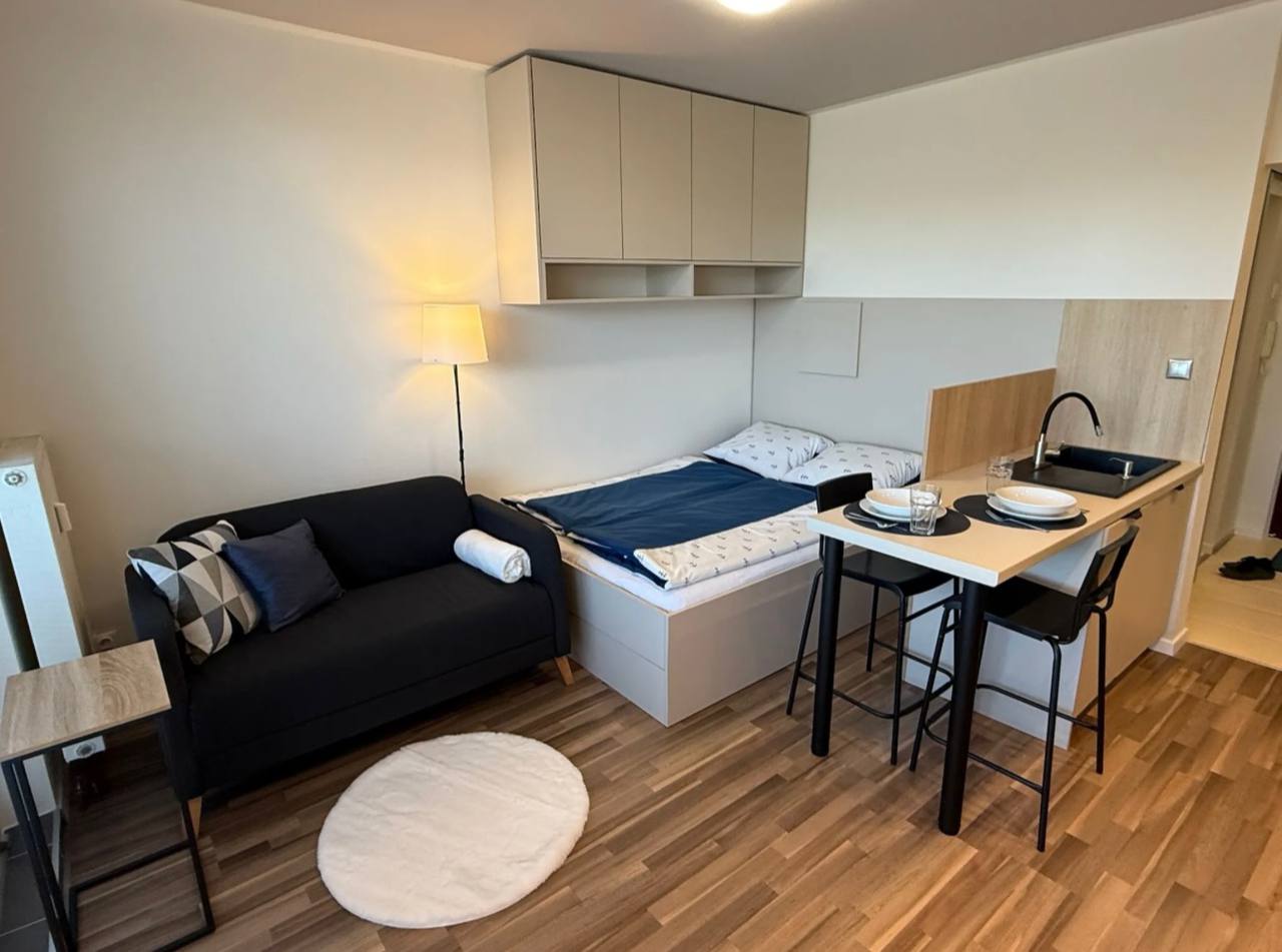 After complete renovation, furnished with new custom-made furniture, including a 140 cm wide bed and sofa, new appliances (washing machine, dishwasher, refrigerator, hob, oven, microwave, kettle, Smart TV), kitchen utensils and a large balcony with glazing in an apartment building near Drazdyak, the new tram and Lidl.