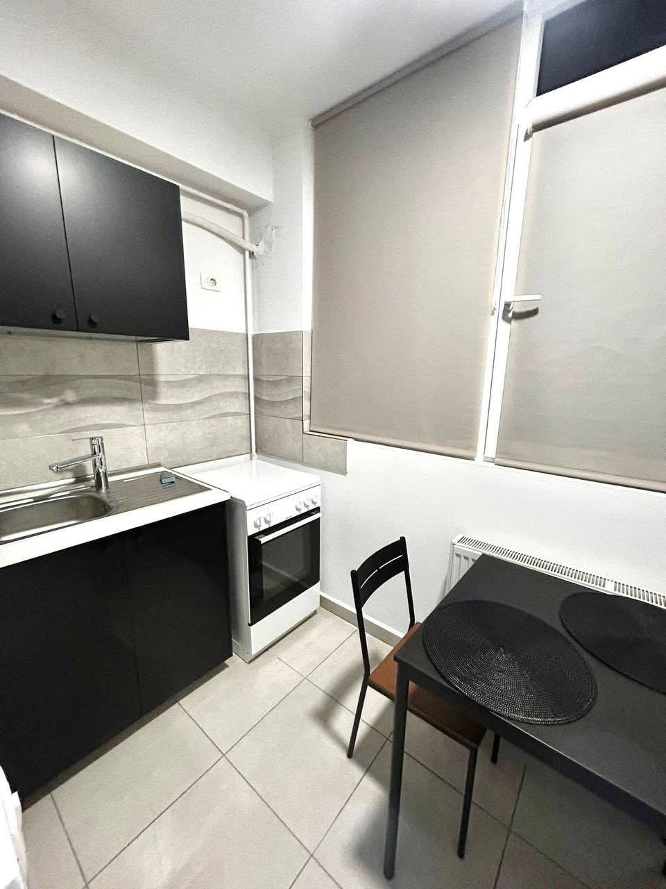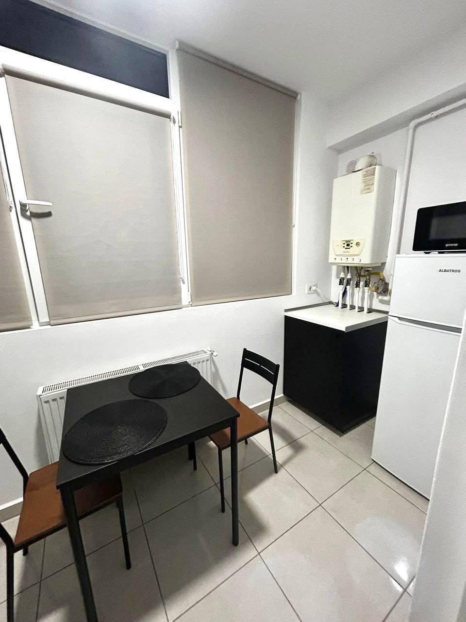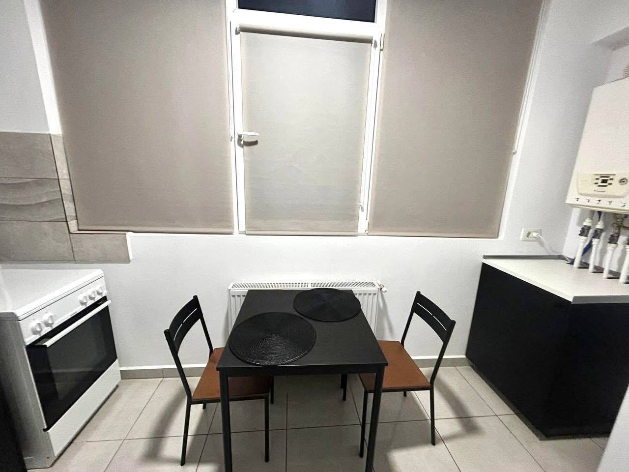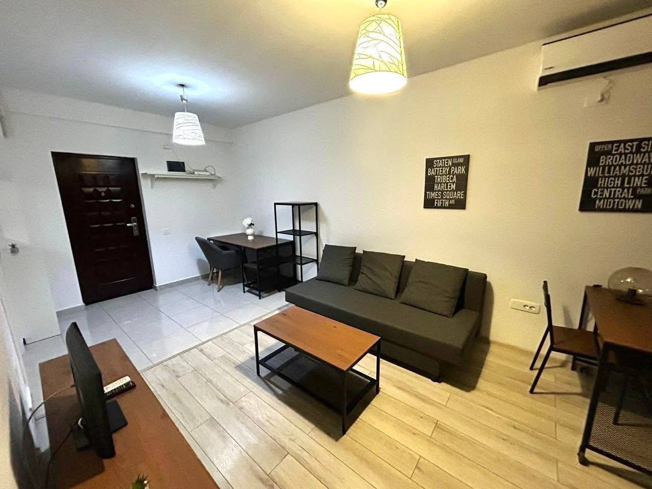 A small two-bedroom apartment is available for rent in Bucharest. The kitchen is on the balcony. The apartment is new. It has a double bed and a fold-out sofa. It includes air conditioning, TV, microwave, dishes, and bedding.