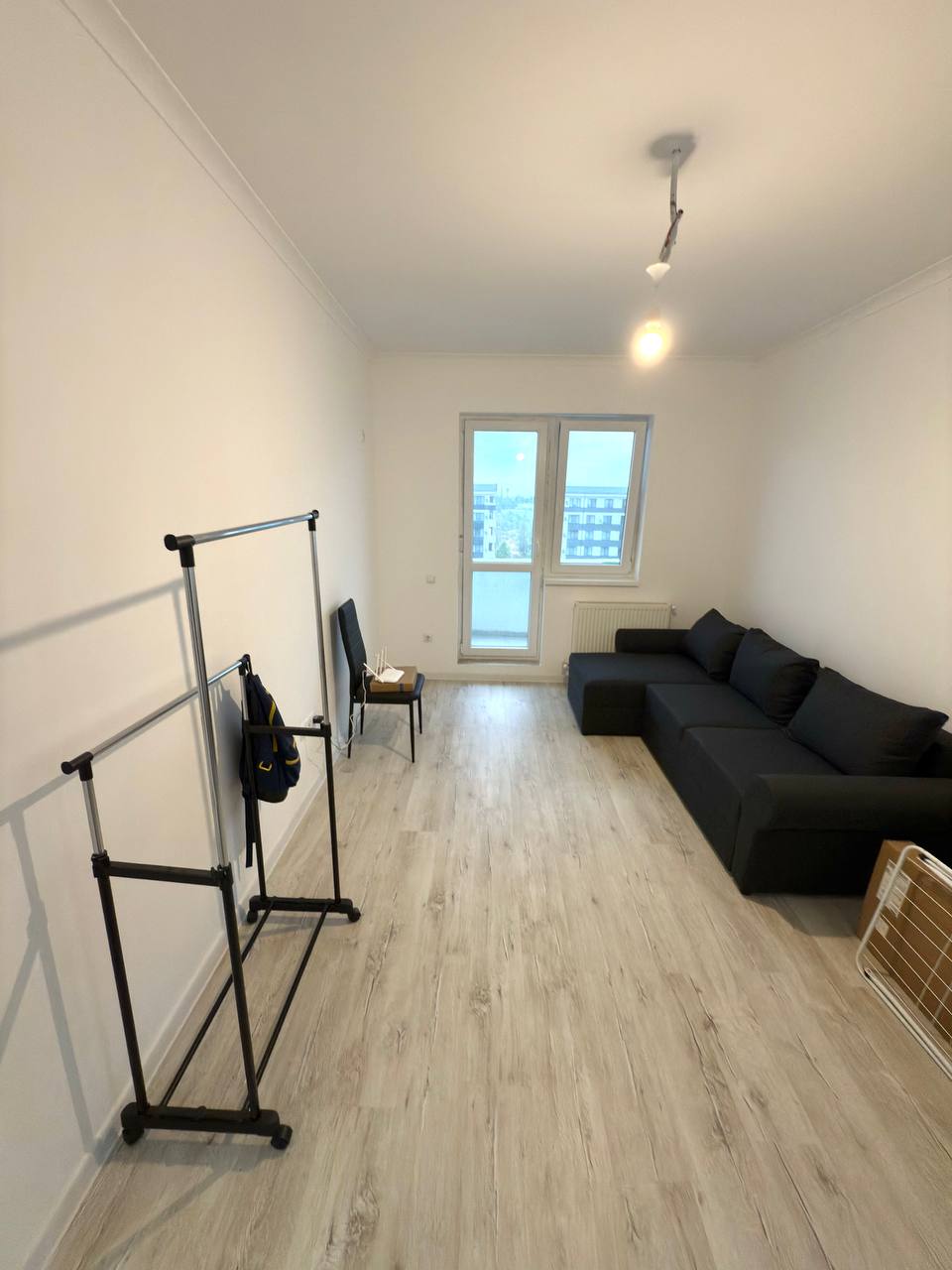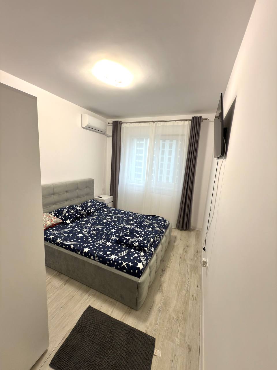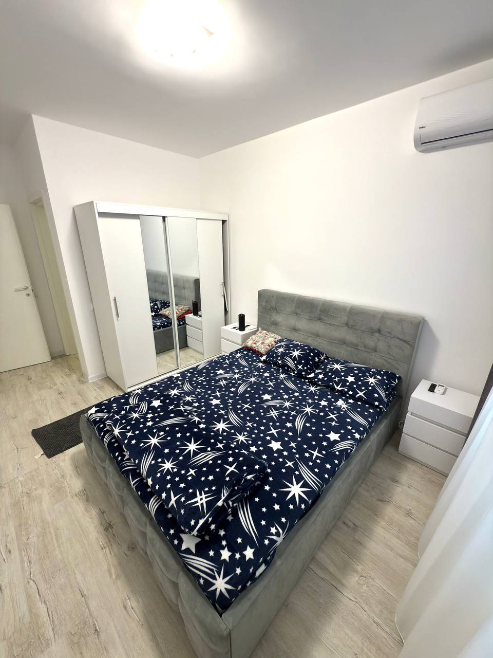 A new three-room apartment in Bucharest is available for rent. 70 square meters. It has two separate rooms, each with a double bed and a living room. There's also a pull-out sofa, two bathrooms, and a separate kitchen with two balconies. It also has its own parking space. The apartment is furnished with dishes, bedding, pillows, a microwave, etc.