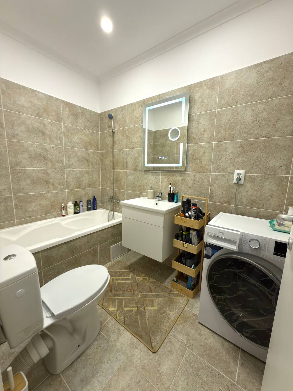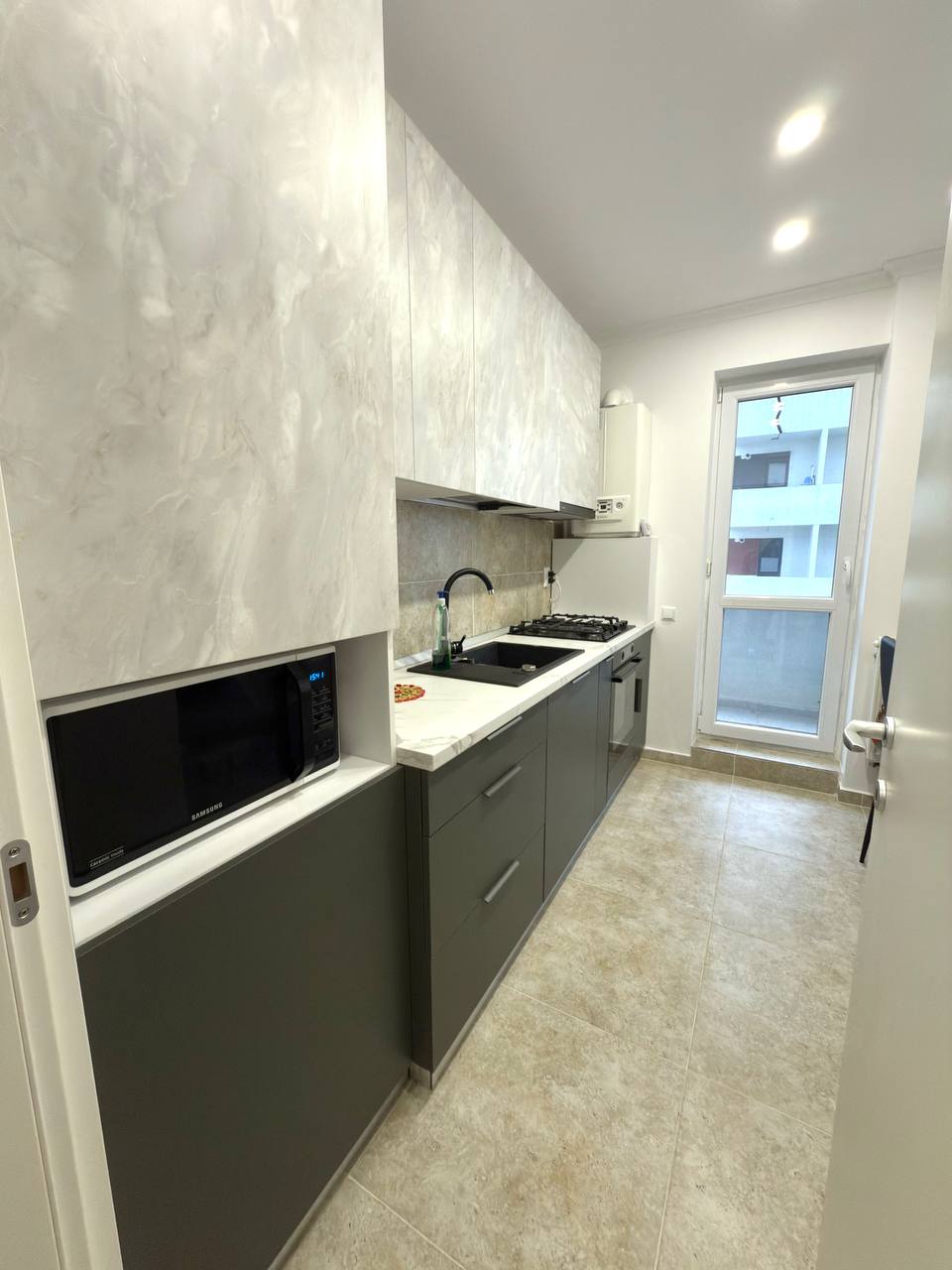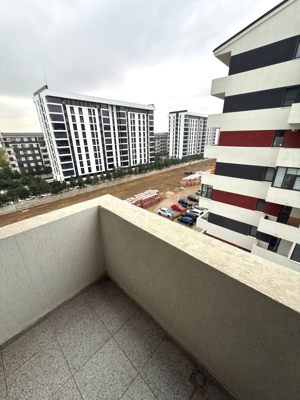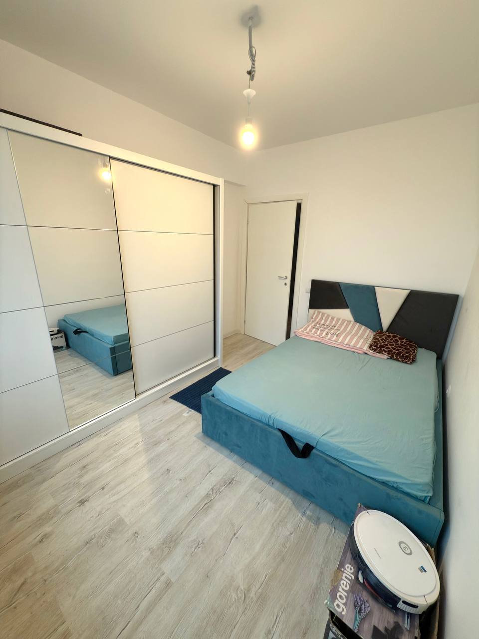A new three-room apartment in Bucharest is available for rent. 70 square meters. It has two separate rooms, each with a double bed and a living room. There's also a pull-out sofa, two bathrooms, and a separate kitchen with two balconies. It also has its own parking space. The apartment is furnished with dishes, bedding, pillows, a microwave, etc.