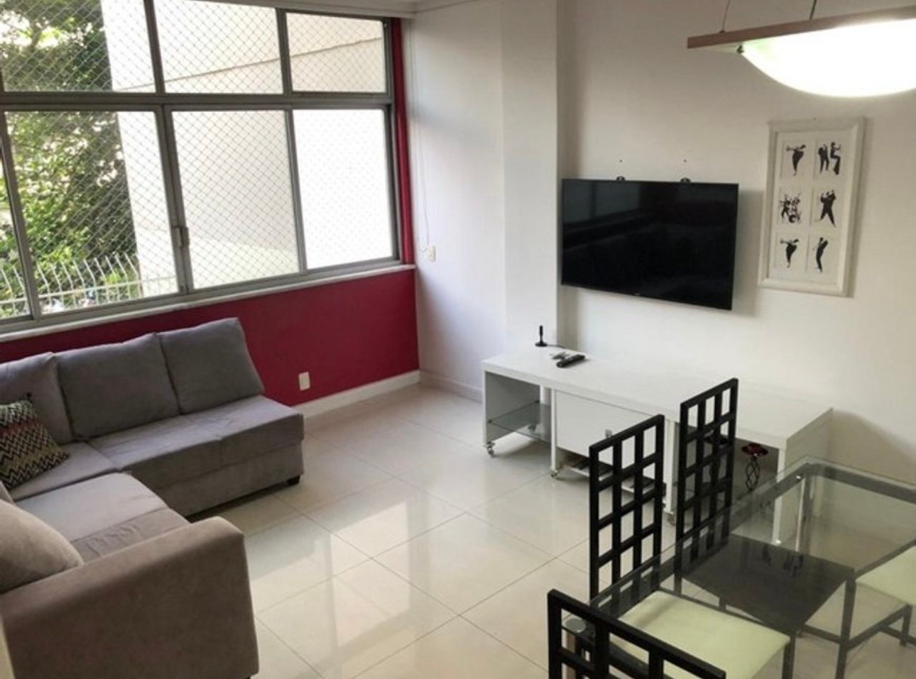 Sala de estar con sofá, Smart TV y comedor.