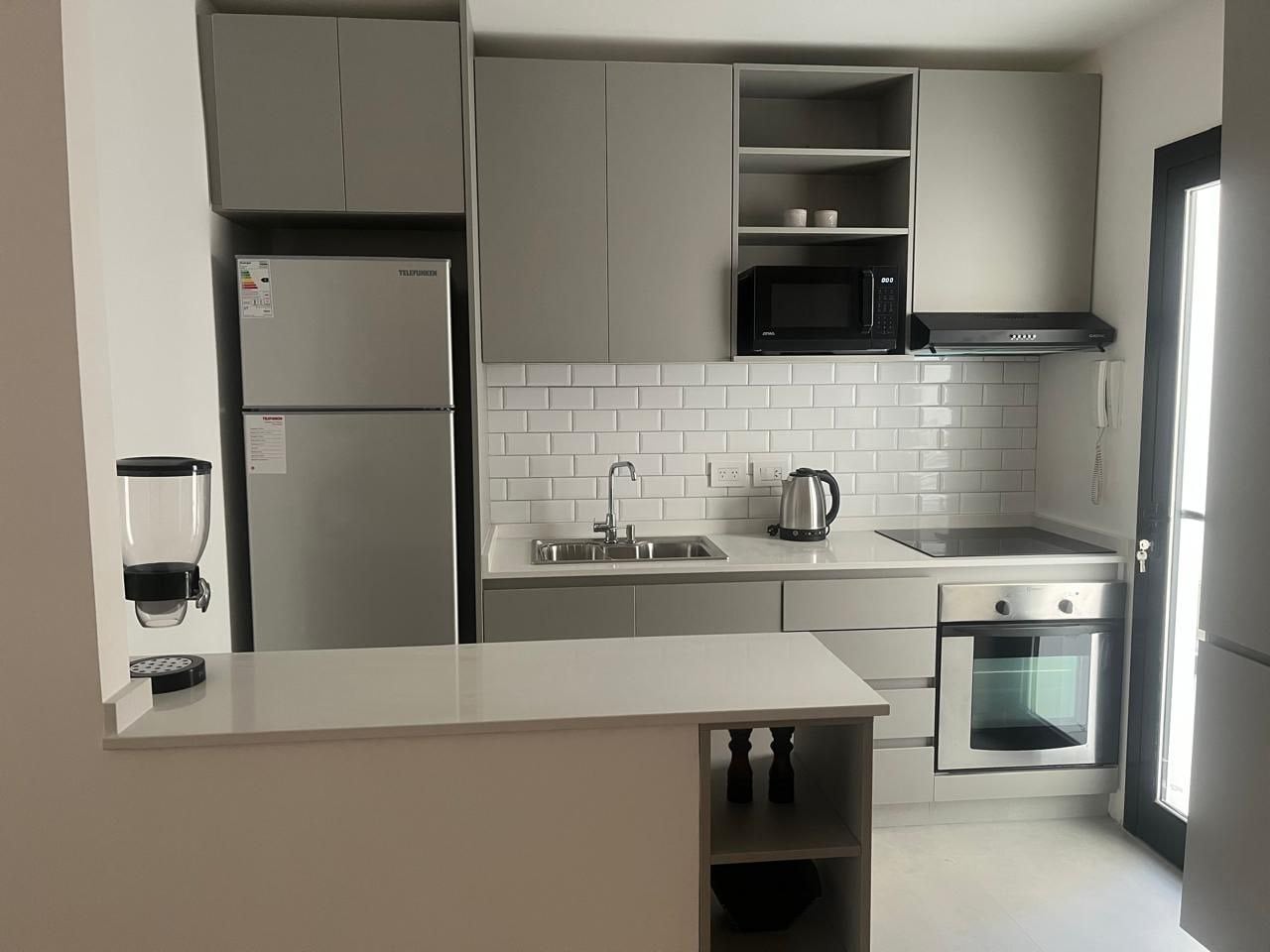 La cocina, totalmente equipada, se integra con la sala de estar, separada por una barra americana, y tiene acceso a un patio cubierto con lavadora.