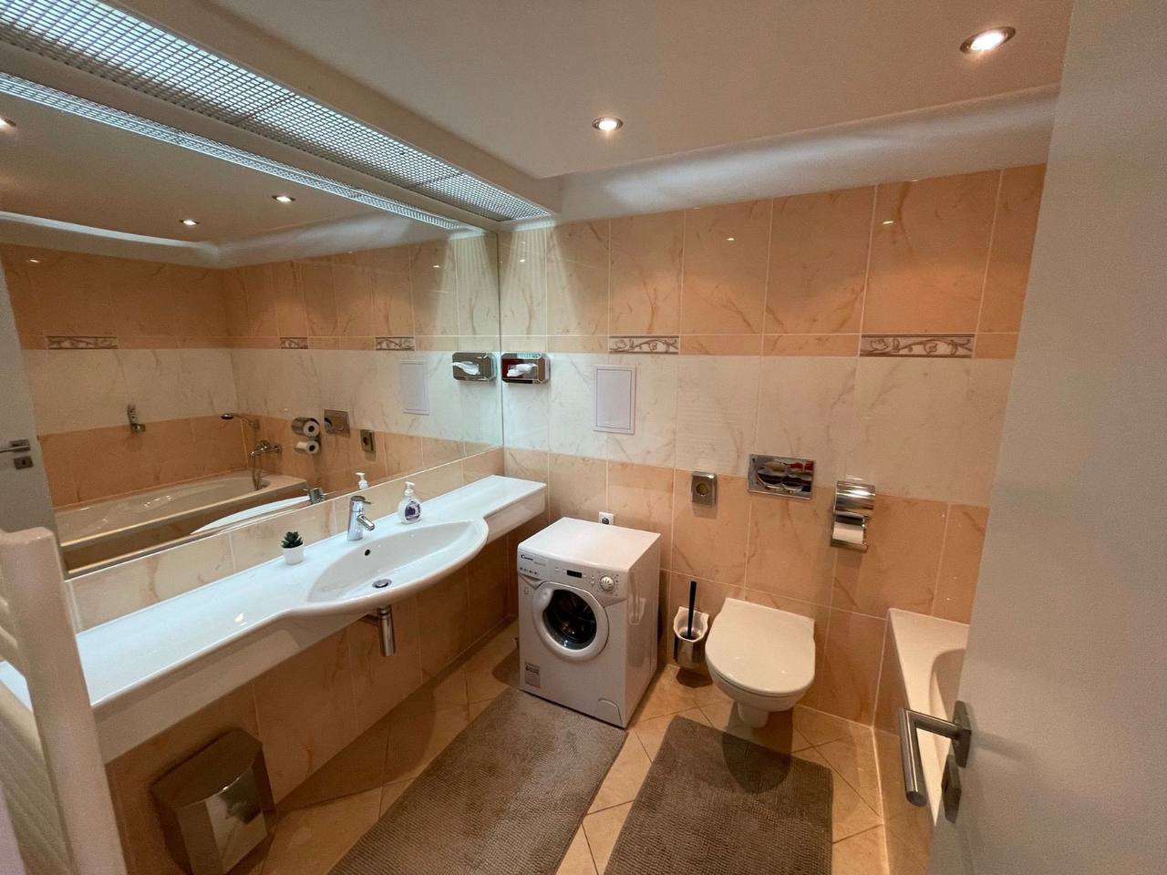 La cocina está totalmente equipada con electrodomésticos, sofá cama, amplio espacio de almacenamiento, baño con bañera e inodoro, lavadora, calefacción y aire acondicionado propios.