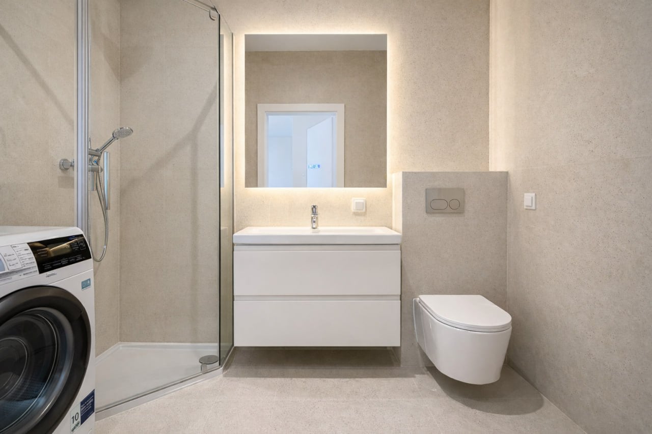 · ванна кімната з душем і пральною машиною
