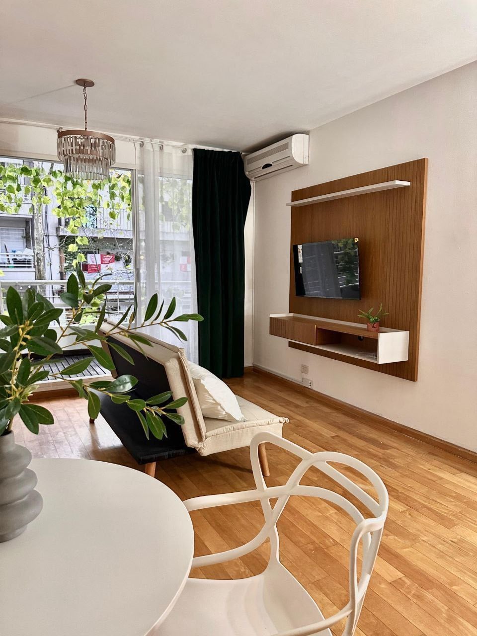 Description : Studio avec balcon. Chauffage au sol. Climatisation. Lit convertible (amovible pour gagner de la place). Canapé et TV. Réfrigérateur, micro-ondes, four et plaques de cuisson neufs. Salle de bain avec baignoire. Balcon avec hamac.
