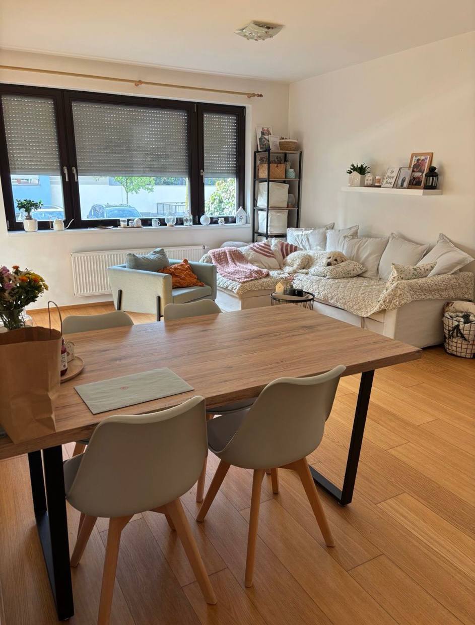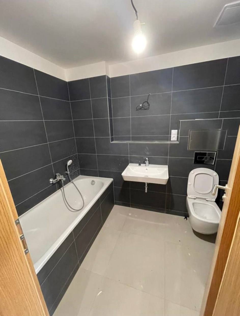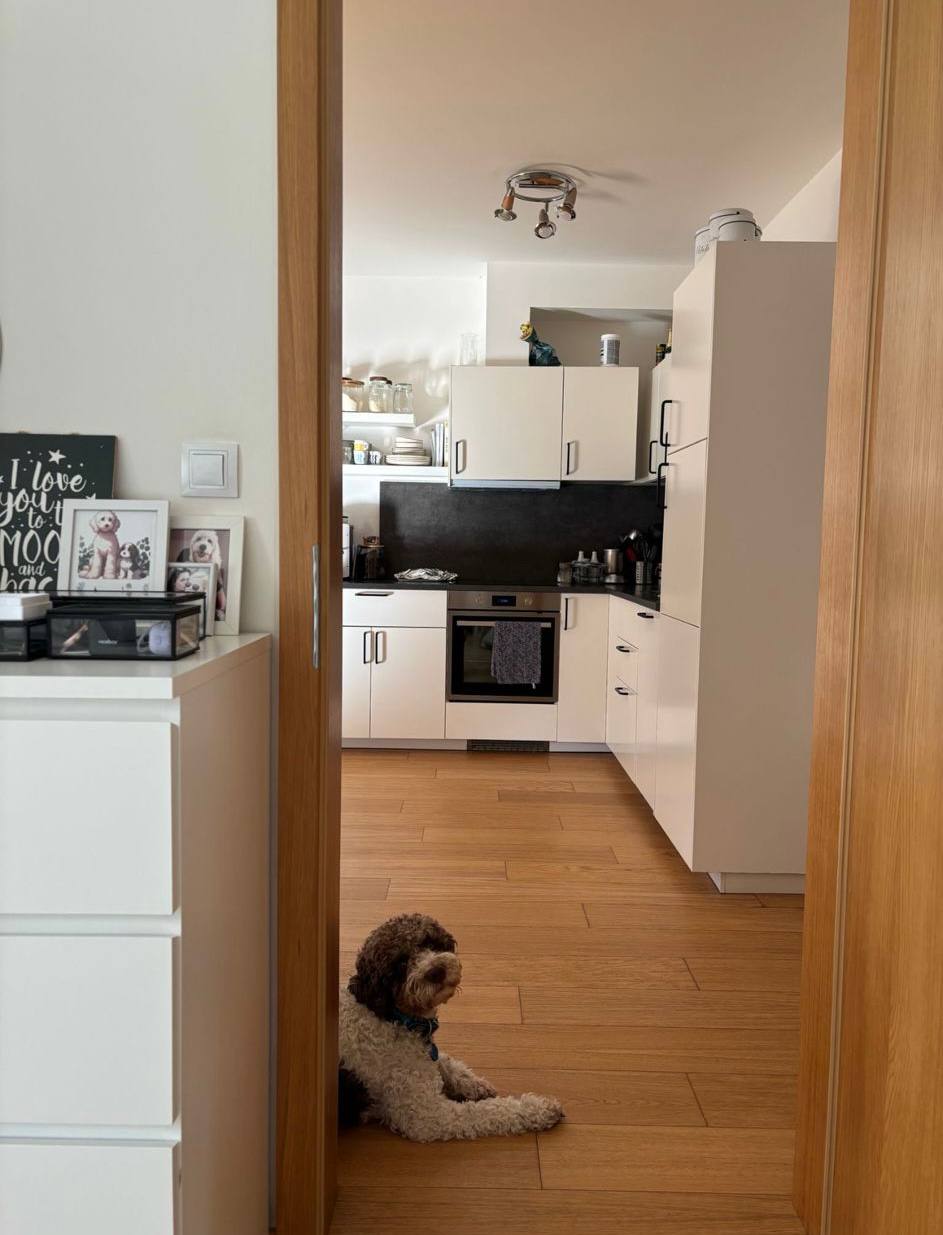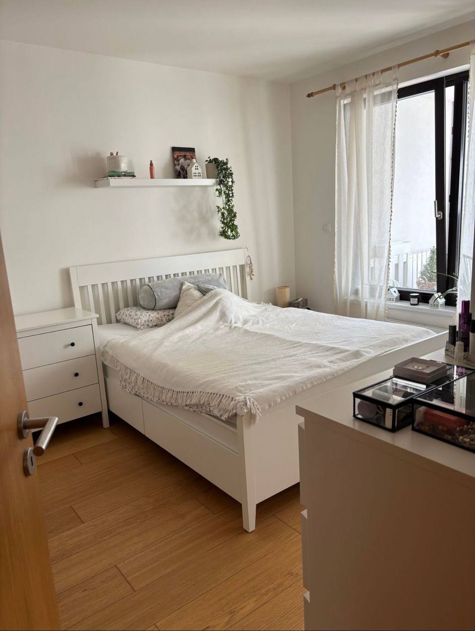 Appartement lumineux 2+kk dans un immeuble neuf. Non meublé, mais avec cuisine équipée. Les photos montrent un appartement meublé, mais le locataire actuel retirera les meubles. Immeuble moderne dans un quartier calme avec une bonne qualité de construction. Bonne accessibilité — transports en commun à 6 minutes à pied.