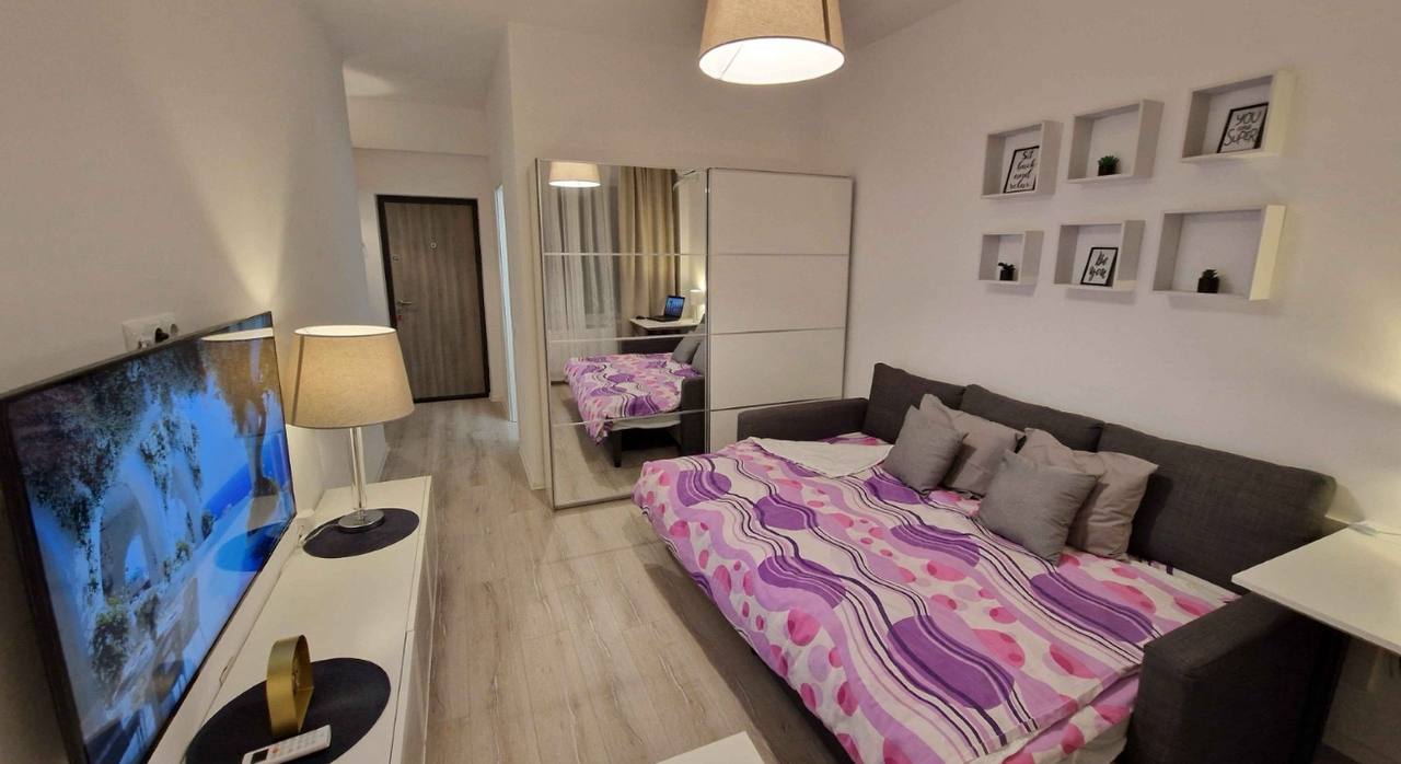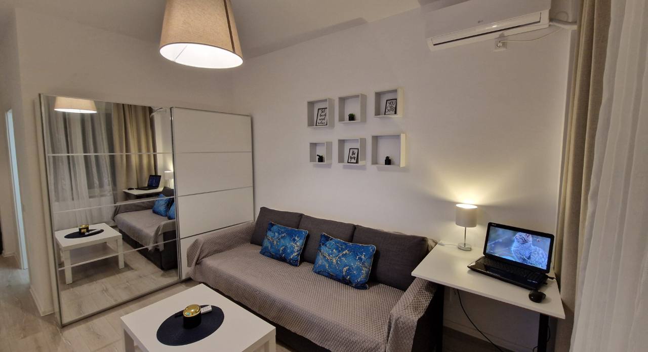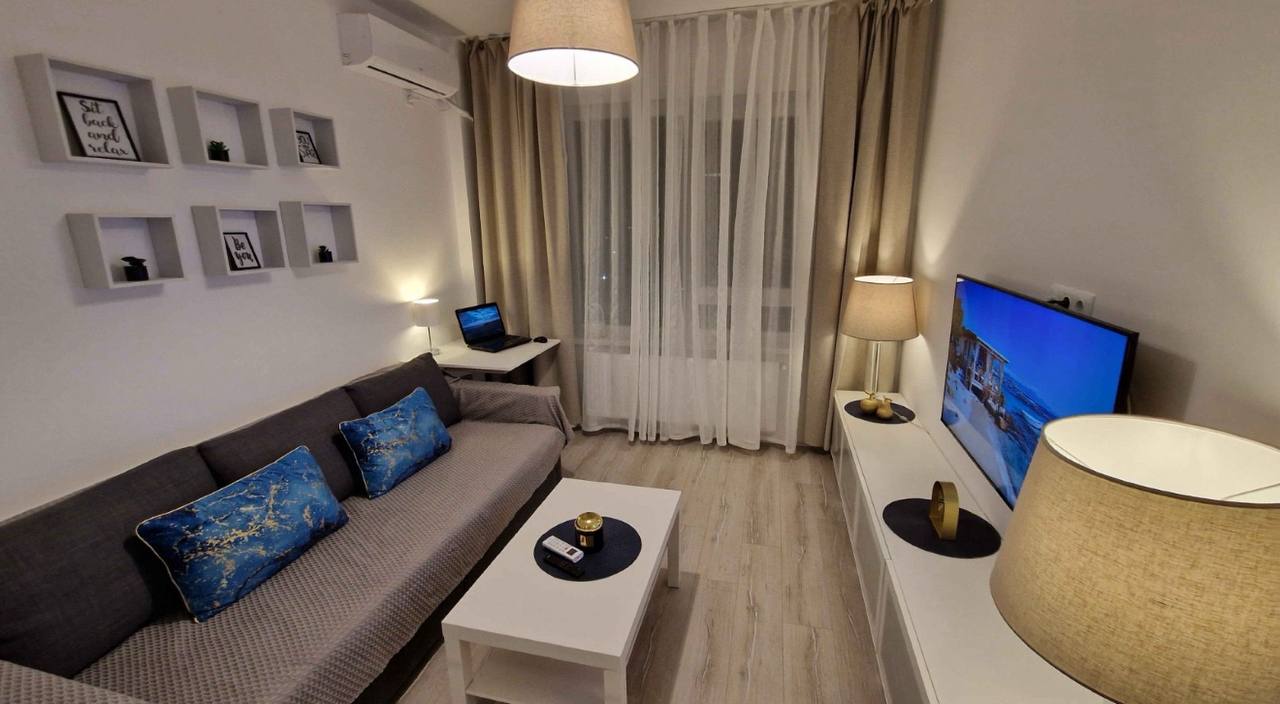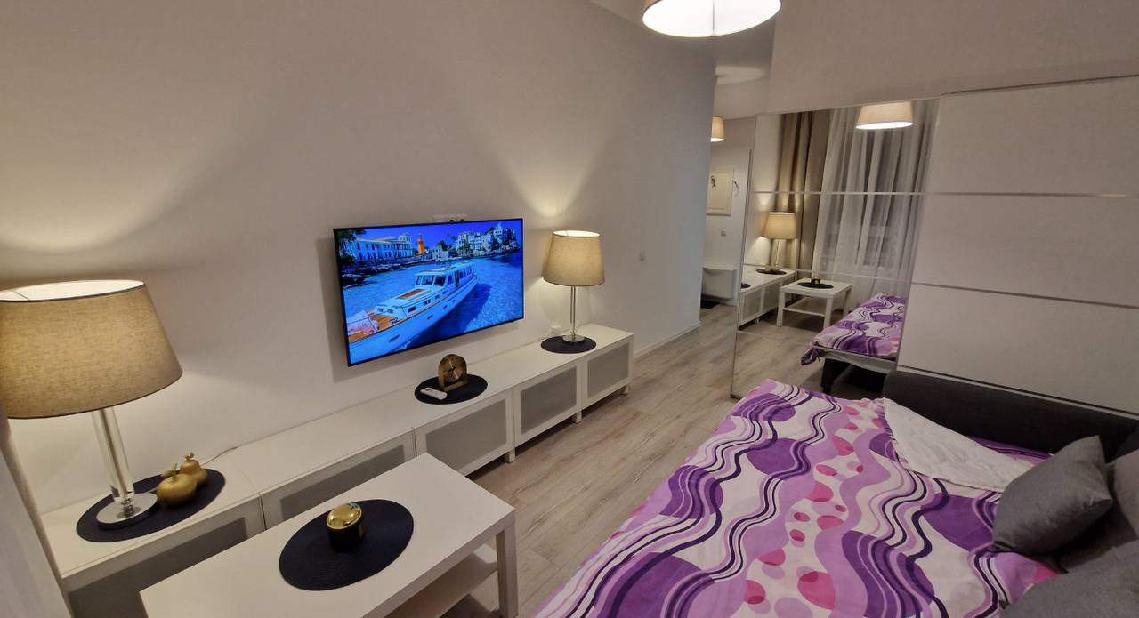 Un appartement d'une pièce avec cuisine séparée et balcon est disponible à la location. Il dispose d'une télévision connectée et de la climatisation. Un canapé-lit double est également inclus.
