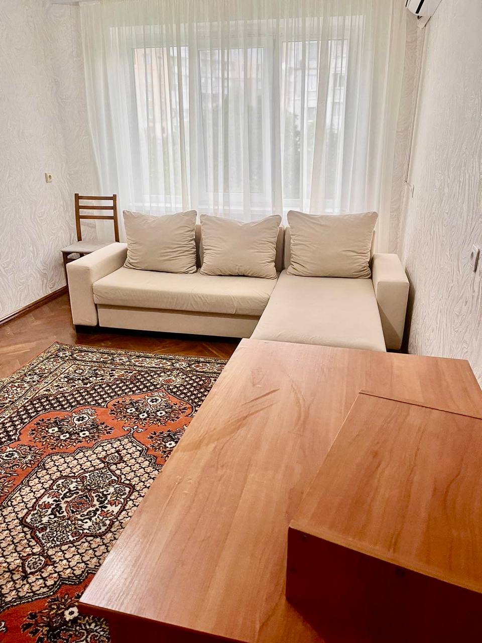 3-Zimmer-Wohnung. A. Russo Str. 55, 6./9. Stock. Möbliert, inklusive TV, Kühlschrank mit Doppelverglasung, Waschmaschine, Backofen, Geschirrspüler und Mikrowelle. Die Küche wurde zu einer Loggia erweitert. Vom Schlafzimmer aus gelangt man auf einen verglasten Balkon.