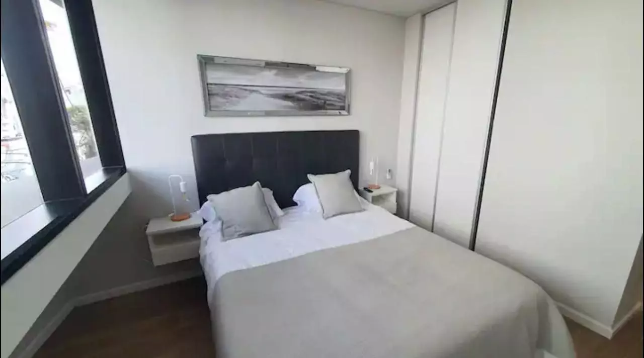 In the bedroom: double bed, wardrobe, TV.