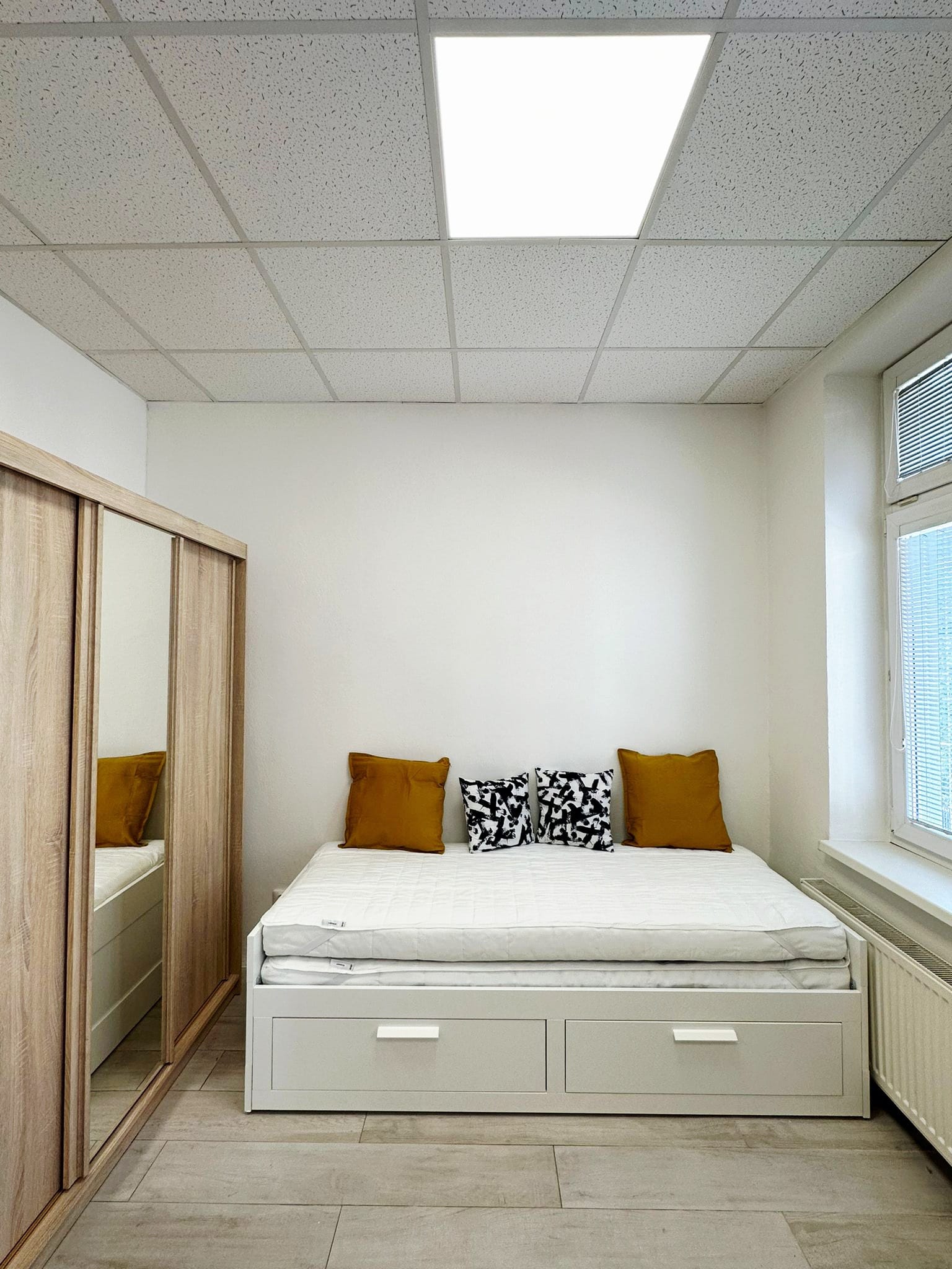The apartment is located on the 2nd floor of a brick building without an elevator. Completely new reconstruction. Kitchen unit with sink, freestanding stove with ceramic hob, extractor hood, refrigerator with freezer, wardrobe, wooden floor, bed, bathroom with bathtub, washing machine and toilet.
