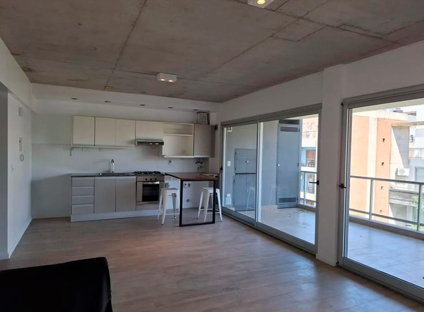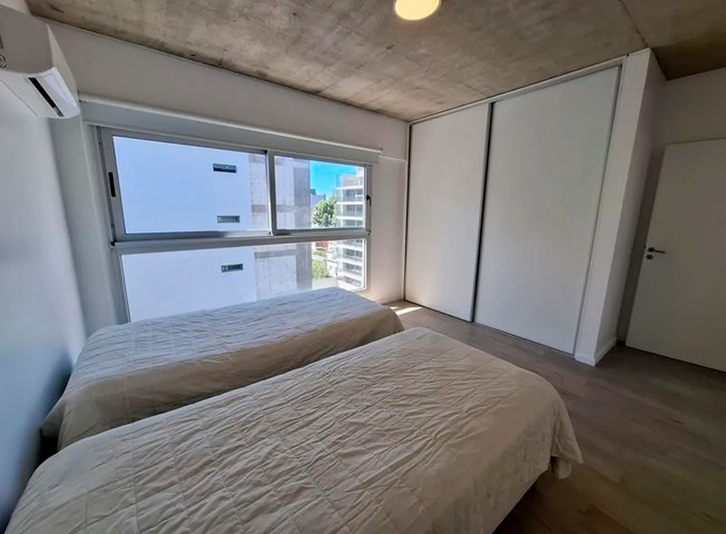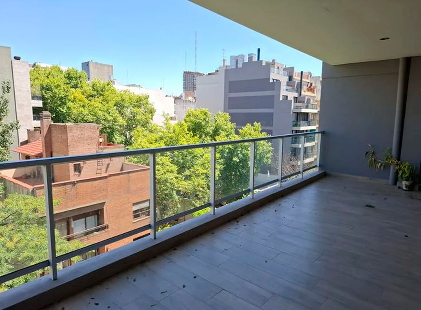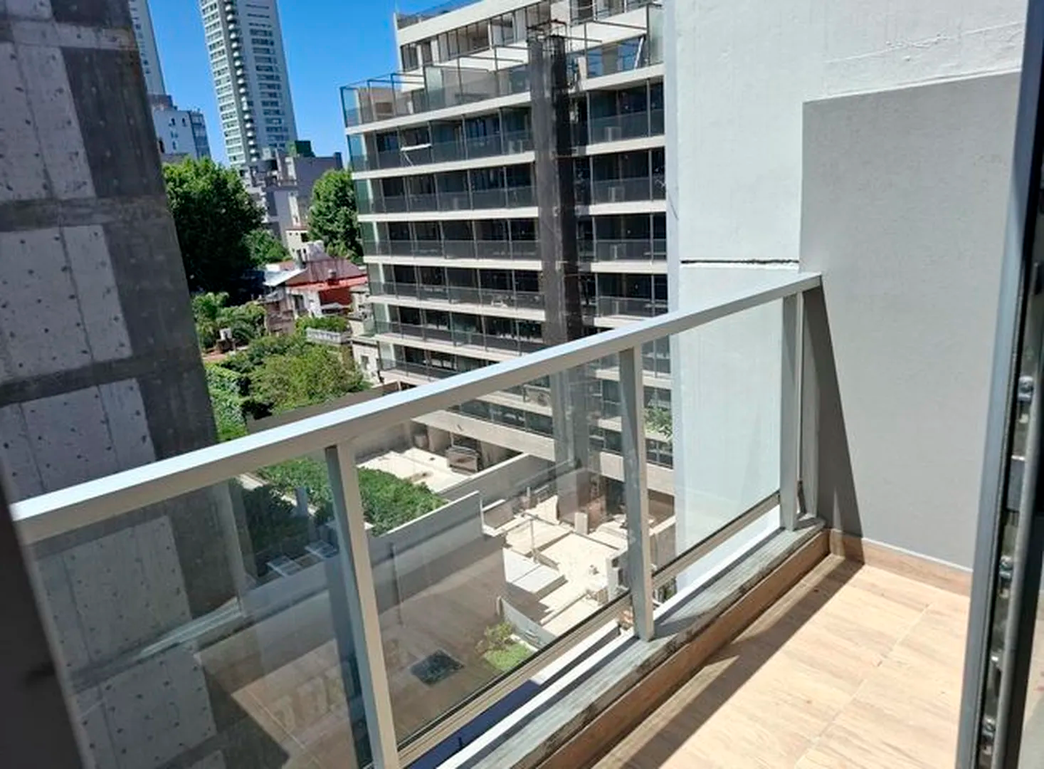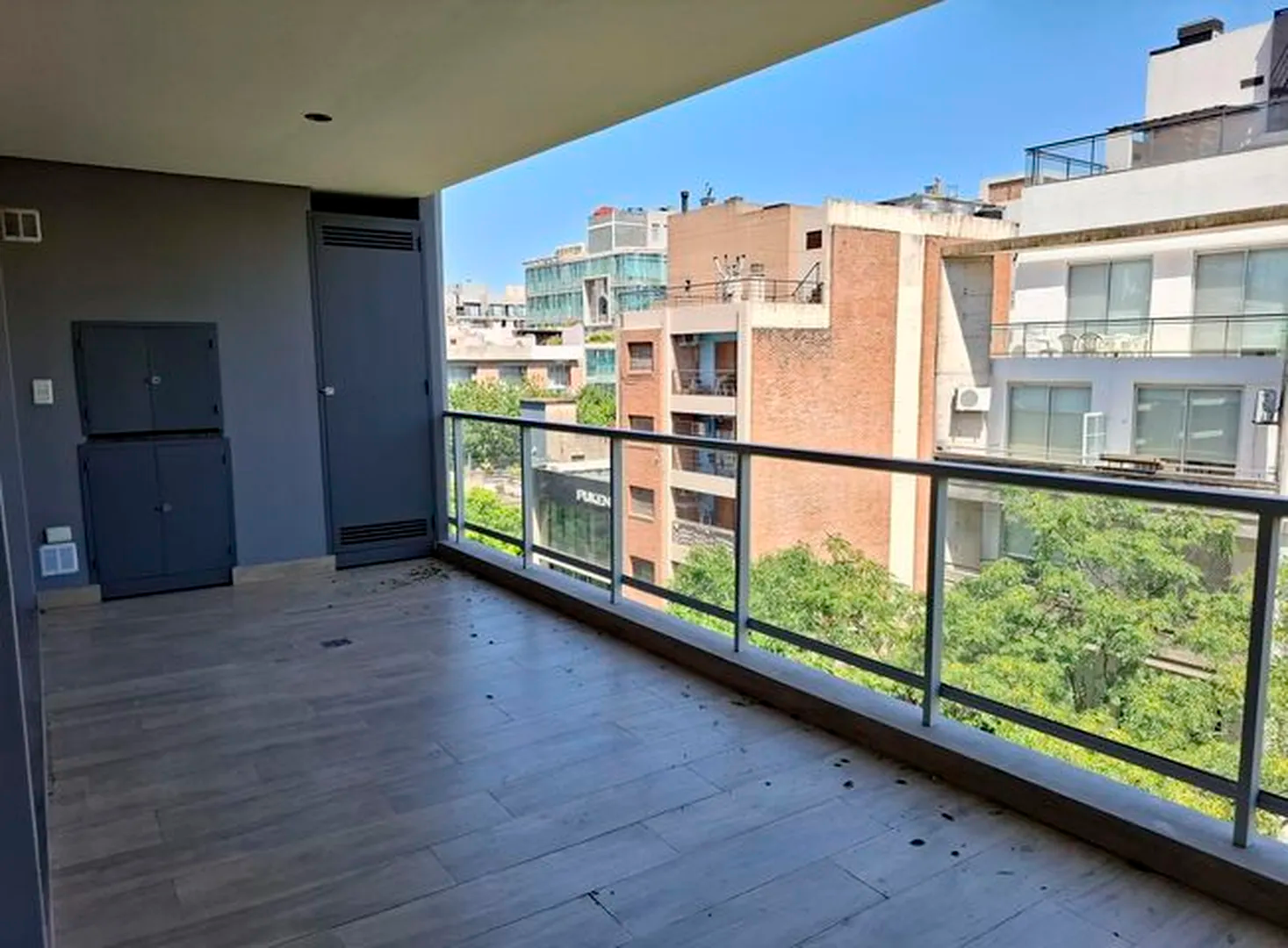 Amplio piso de 3 ambientes 3 años de antigüedad al frente. Vista abierta, muy luminoso, con 2 balcones terraza y parrilla propia. 2 dormitorios, uno en suite con vestidor, 2 baños completos con bañera. Cocina abierta con muebles completos, espacio y conexion para lavarropas y lavavajillas, Horno elect. y anafe a gas Longvie, placards con interiores y frente integral, carpintería de aluminio anodizado natural A30 new con vidrio laminado 3+3, pisos de porcelanato simil madera marca ILVA, 3 equipos de aire acondicionado frío calor, agua caliente individual (calefón Orbis), grifería monocomando FV, bacha Johnson, sanitarios Ferrum. Excelentes terminaciones. Servicios individuales. Terraza común. solarium con ducha. Portero visor con pantalla. Cámaras de seguridad en todos los pisos. Alarma. Artefactos de iluminación en todos los ambientes excepto living.