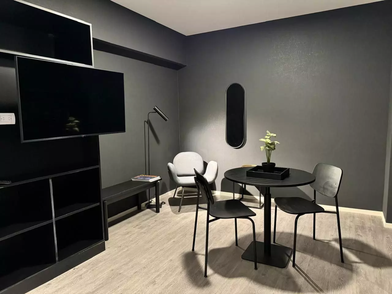 Описание: студия. Две односпальные кровати. Зеркало, картины и кресло с удобным светом для чтения в гостиной. Ванная комната в кирпичной текстуре с душем. Кухня с холодильником, nespresso, тостером и микроволновкой. TV и WiFi.