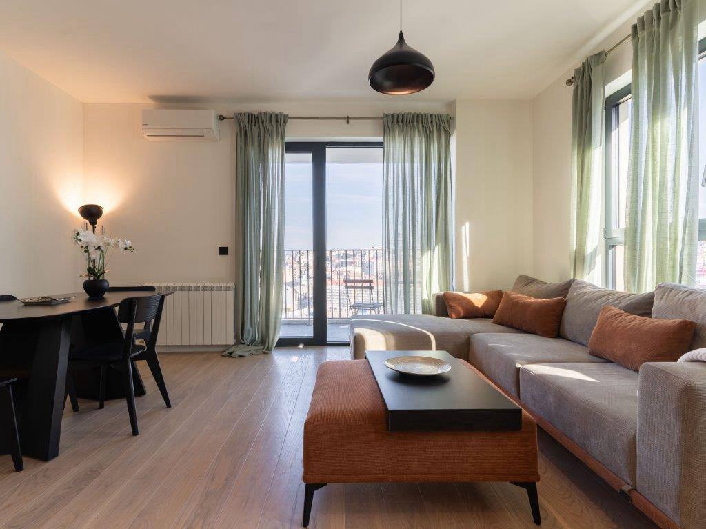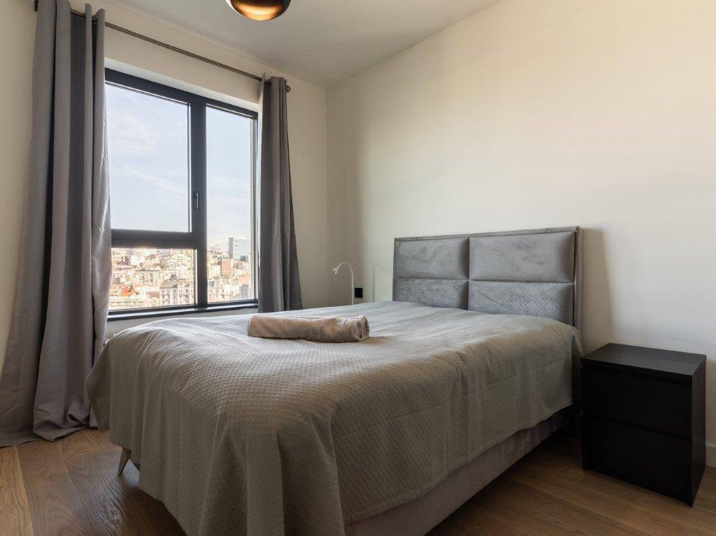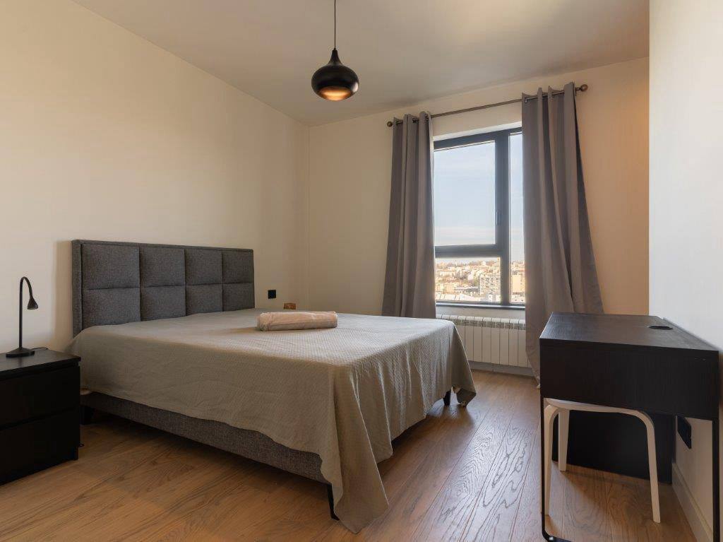 - площадь: 86м² - этаж: 11 - центральное отопление - установлен кондиционер в каждой из комнат, стиральная, сушильная и посудомоечная машины - 2 ванные комнаты, балкон - доступно парковочное место в гараже (+100€)